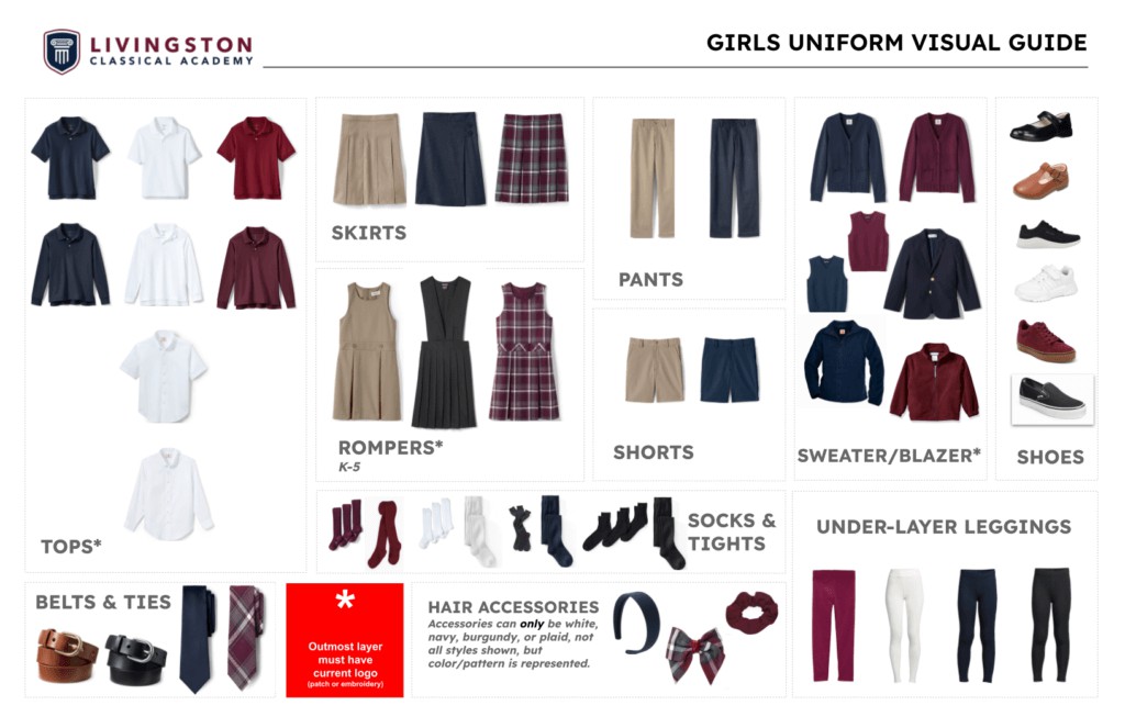 The uniform policy at Livingston Classical Academy is not meant to be financially prohibitive for any student’s ability to attend our school. If you need assistance with uniforms please contact the school office at LivingstonClassical@ChoiceSchools.com. All information will be kept confidential.
